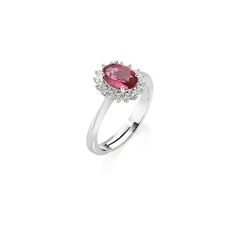 Anello regolabile Amen Lady ANLDPBBCI2 da donna in argento 925 rodiato. Questo anello, ispirato allo stile "Mini Royal Lady", cattura l'attenzione con un vivido zircone ovale color rosso ciliegia (8x6 mm) centrale, circondato da una luminosa corona di zirconi bianchi. La misura è regolabile per le taglie dalla 10 alla 14, offrendo un tocco di eleganza regale. Codice ANLDPBBCI2.