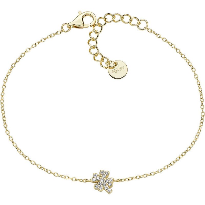 Bracciale con Charms fissi da donna Amen Coccole Luxury BRQUPGBZ3. Realizzato in Argento 925 con finitura dorata, questo bracciale a catena è adornato da un mini charm a quadrifoglio da 7 mm, interamente rivestito in pavé di luminosi zirconi bianchi. La lunghezza è regolabile da 16 cm a 19 cm, grazie all'allungo. Il quadrifoglio è simbolo universale di buona sorte e fortuna. Perfetto per un look elegante e portafortuna o come dono augurale per un nuovo inizio. Codice BRQUPGBZ3.